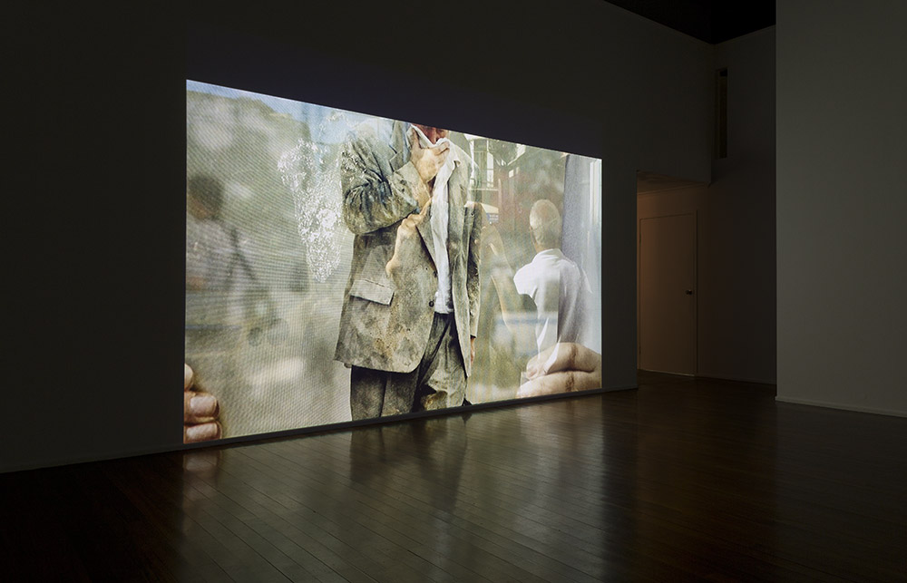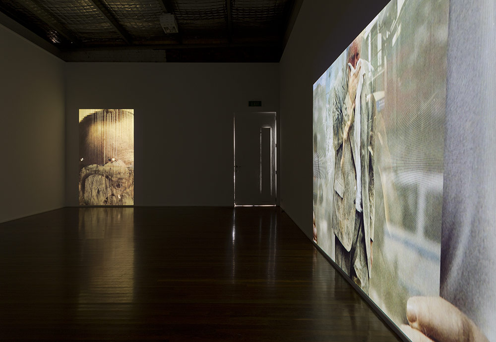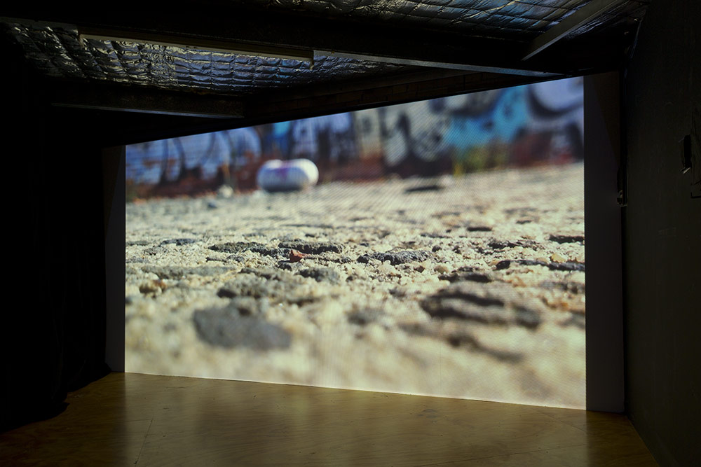 An installation of five phone-camera films from the Amateur Prop series made on the streets of Lisbon and Melbourne over the last two years, presented here as four large projections across three rooms.