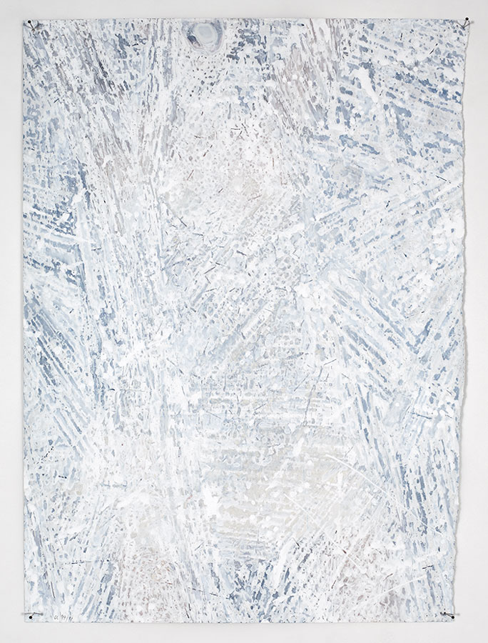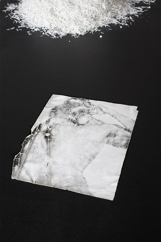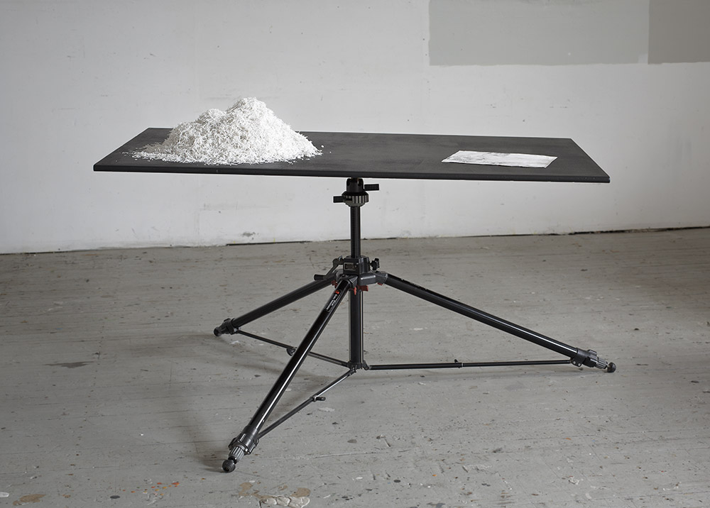 partially erased magazine page, rubber erasings pile, tabletop and tripod