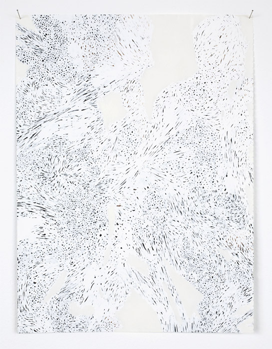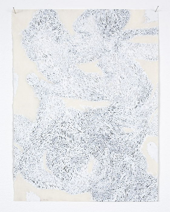 The Gorgonia are correction fluid on erased magazine pages, posters and photographs. Like the Compress works they are generally presented unadorned, pinned to the wall.