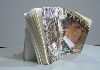 CC: At the Collins Place Eyecare site talk (Site #4) Tony Perry characterized the magazine as an assassin. Observing that even though this Vogue Hommes is a fashion magazine it doesn’t have a model on the front (cover), it has a celebrity, he went on to vigorously describe the celebrity magazine as being the most pernicious sort of assassin because, as it’s foregrounding one person it has moved on. While you’re still privileging that person in the magazine it’s already working to displace that person and replace them with someone else. So it’s one of the cruelest sorts of things in a temporal sense as it is always ahead of you, moving on to someone else while you have that. I thought that was a very interesting observation about…
