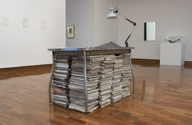 steel table, magazines, rubber erasings, metal ruler, lamp, correction fluid pens, pencils, erasers, scalpel and paper