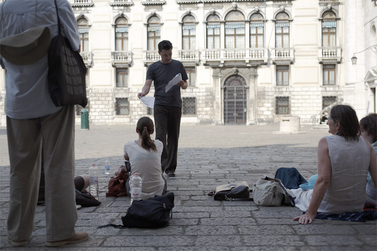 Tom Nicholson begins his site talk Actions Towards the Image by setting Christian Capurro's Another Misspent Portrait of Etienne de Silhouette against Tieoplo's two great paintings of Antony and Cleopatra, and specifically against the relationship between the oil painting in the National Gallery of Victoria in Melbourne (where Capurro's project originates) and the fresco version at Palazzo Labia in Venice (where the site talk takes place). He also discusses how the project articulates a relationship between an action and its trace, describing this relationship in terms of both the history of performance art and principles of drawing. Tom will present the talk once in English and again, later in the day, in Italian.